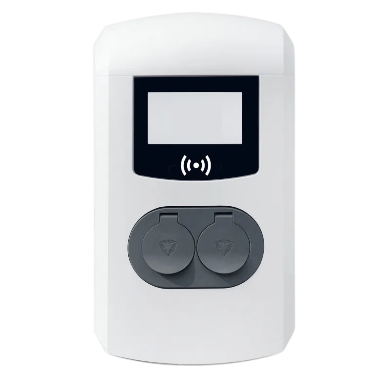 De standaard versie heeft 2 sockets die elk op 22kW kunnen laden. De beschikbare stroom wordt echter niet onderling verdeeld. Indien je de stroom wel wilt verdelen kun je gebruik maken van smart charging network, waarbij de beschikbare stroom optimaal over alle laders verdeeld wordt.