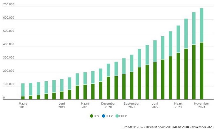 Het aandeel voertuigen dat geen gebruik maakt van fossiele brandstof, is in minder dan vijf jaar tijd van ruim 100.000 naar bijna 700.000 gestegen.