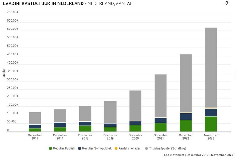 Het aantal laadpunten in Nederland stijgt nog steeds behoorlijk, met name de thuislaadpunten, schieten als paddenstoelen uit de grond. Inmiddels zijn er meer dan 600.000 punten in Nederland waar een elektrisch voertuig of Plug-in Hybride kan worden opgeladen. (Vergelijk: zeven jaar geleden waren dit er nog slechts ruim 100.000).
