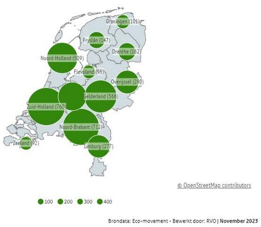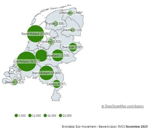 In Nederland rijden per november 2023 427.804 (334.186 per 31-01-2023) volledig elektrische auto’s (BEV - donkergroen) en 256.680 (192.247 per 31-01-2023) Plug-in hybrides (PHEV - zwart) rond. In deze infographic is voor de eerste keer ook het aantal voertuigen dat op waterstof rijdt, meegenomen. Dit zijn er in november 2023 609.