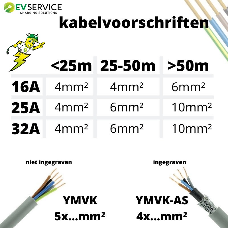 We raden aan om de onderkant van de lader op een hoogte tussen 80 en 100 cm vanaf de grond te plaatsen. Een volgend belangrijk punt is de dikte van de stroomkabel. Deze is afhankelijk van de afstand tussen de meterkast en de lader, en het vermogen wat er doorheen gaat.